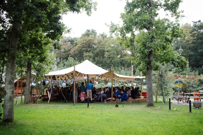 Er is een mooie stretchtent, een grote vuurplaats en een binnenruimte met keuken. In deze binnenruimte zijn ook douches en toiletten aanwezig.